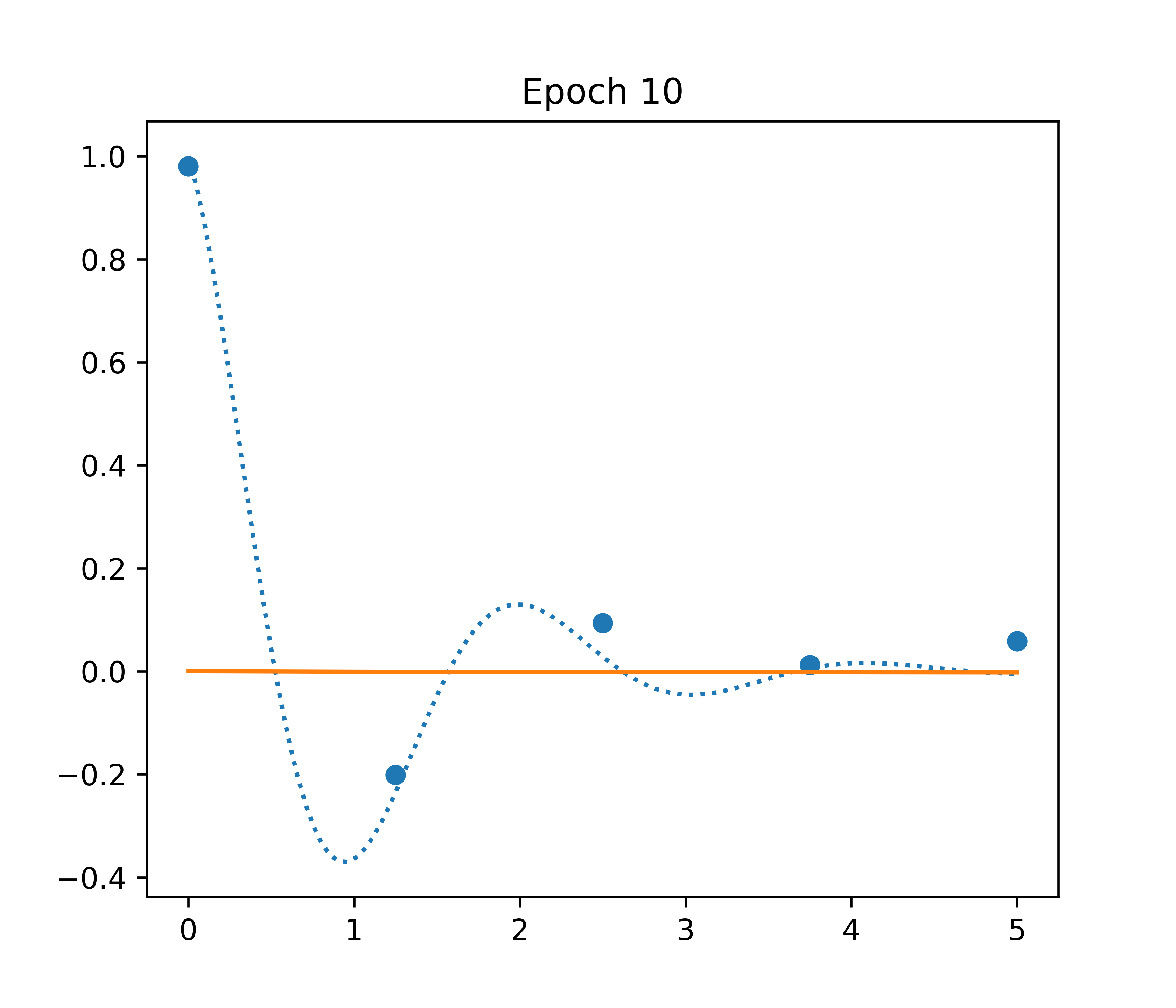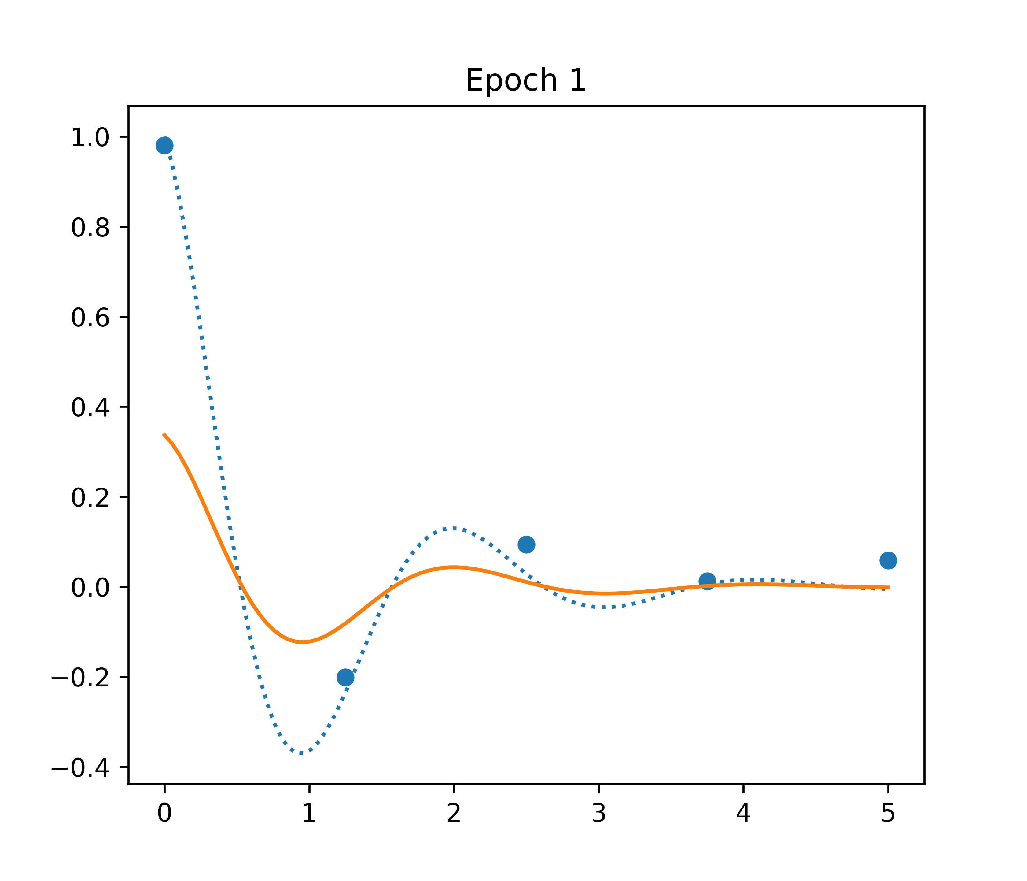 \[\frac{\mathrm{d}^2y}{\mathrm{d}t^2} + 2 \frac{\mathrm{d}y}{\mathrm{d}t} + 10y = 0\] Sample 5 noisy points